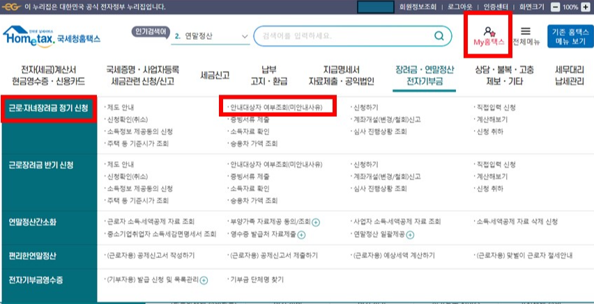 1. 홈택스(www.hometax.go.kr) 접속하여 로그인하고 '근로자녀장려금 정기신청' 메뉴에서 안내대상자 여부 조회 가능
